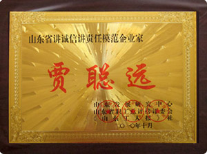 2011年5月份,公司總經(jīng)理賈聰遠(yuǎn)榮獲山東省講誠信、講責(zé)任模范企業(yè)家稱號并在“山東工人報(bào)”和“時代風(fēng)采雜志”作文章介紹。