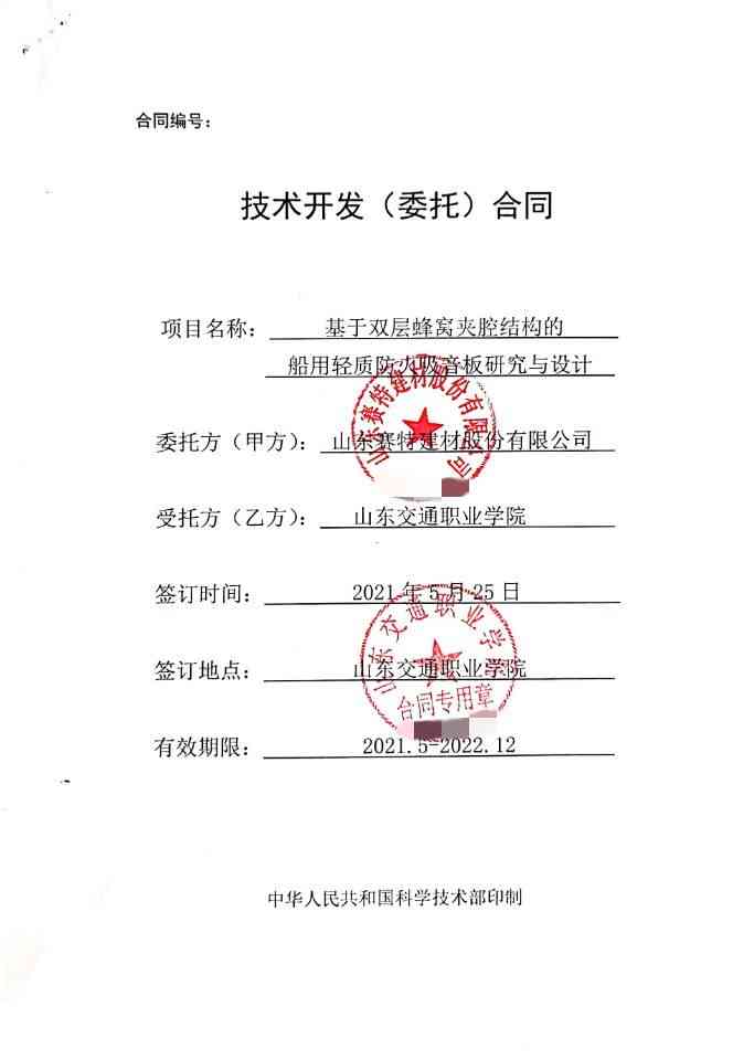 為增強職業(yè)健康防護、培育海洋經(jīng)濟新動能,山東賽特建材股份有限公司與山東交通職業(yè)學院簽署科研合作協(xié)議,共同開展“基于雙層蜂窩夾腔結(jié)構(gòu)的船用輕質(zhì)防火吸音板研究與設計”,基于該項目的重大科研價值,項目被列入濰坊市2021年科學技術(shù)發(fā)展計劃。